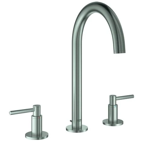 GROHE Atrio 3-Loch-Waschtischbatterie, DN 15 Keramik-Oberteile 1/2”, 90 Grad GROHE StarLight Oberfläche GROHE EcoJoy 5,7 l/min Laminar Mousseur schwenkbarer Bogenauslauf mit Anschlagbegrenzung Zugstangen-Ablaufgarnitur 1 1/4” druckfeste, flexible Verbi