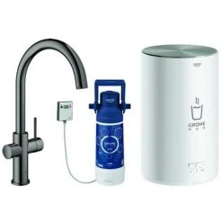 GROHE Red Duo Armatur und Boiler Größe M GROHE Red Duo Einhand-Spültischbatterie, Einlochmontage C-Auslauf GROHE ChildLock Drucktasten für kochendes Wasser TÜV zertifizierte elektronische Sicherung gegen versehentliches Aktivieren GROHE StarLight Obe