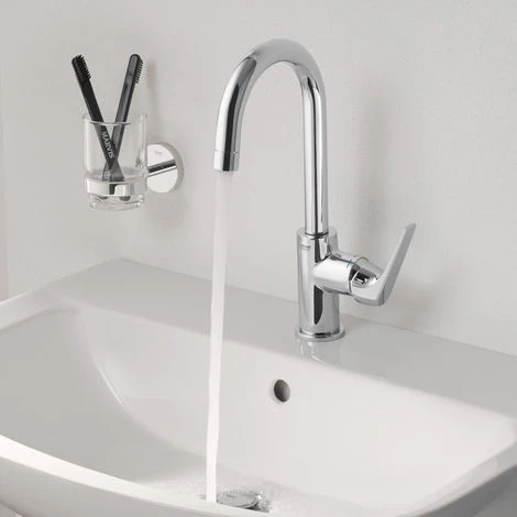 Die übergangslose, fließende Form vom Auslauf über Armaturenkörper bis hin zum Bedienhebel verleiht der Serie BauFlow einen spannenden und lebhaften Touch. Das Zusammenspiel dieser drei Hauptbestandteile interpretiert die Armaturenlinie BauFlow auf eine erfrischende Art und Weise neu. Wie bei allen GROHE Einhebelmischern überzeugt die Handhabung auch hier mit einem weiten Bedienungswinkel und hohem Komfort für den Nutzer.