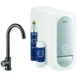 GROHE Blue Home Mono Starter Kit GROHE Blue Home Mono Armatur mit Filterfunktion Einlochmontage, C-Auslauf Drucktasten für 3 gefilterte und gekühlte Tafelwasserarten still, medium, sprudelnd GROHE StarLight Oberfläche schwenkbarer Rohrauslauf, Schwenkb