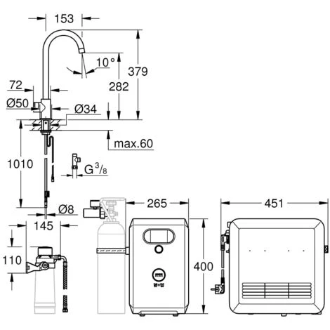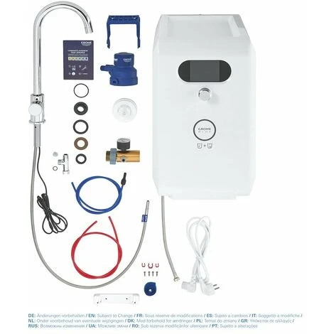 Der für die Inbetriebnahme notwendige GROHE Blue Filter, die 2 kg CO2 Flasche (40 423 000) und die Reinigungskartusche (40 434 001) sind nicht im Lieferumfang enthalten und müssen separat bestellt werden