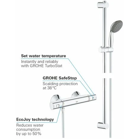 Ein großartiges Duscherlebnis beginnt mit einer zuverlässigen Leistung. Der Grohe Precision Start Duschthermostat sorgt nicht nur dafür, dass die Temperatur Ihrer Dusche stets konstant und ohne lästige Schwankungen bleibt, er bietet auch großartige, familienfreundliche Sicherheitsfunktionen. Dieses Set enthält eine Brausestange und eine Handbrause mit ShockProof Silikonring, der sie vor Schlagschäden schützt. Die Grohe DreamSpray Technologie stellt einen gleichmäßigen Wasserfluss an allen Düsen sicher. Und die Grohe EcoJoy Funktion verringert den Wasserverbrauch beim Duschen um bis zu 50 %. Familien werden die Grohe SafeStop Taste lieben, die die Temperatur auf 38° C begrenzt und so Verbrühungen verhindert. Und die glänzende Grohe Starlight Edelstahloberfläche ist kratzfest und pflegeleicht. Sie sieht auch nach Jahren immer noch makellos aus.Farbe: chromMaße: 695 x 170 x 170 mmMaterial: Metallhält konstant die gewünschte WassertemperaturEigensicher gegen Rückfließen, eingebaute