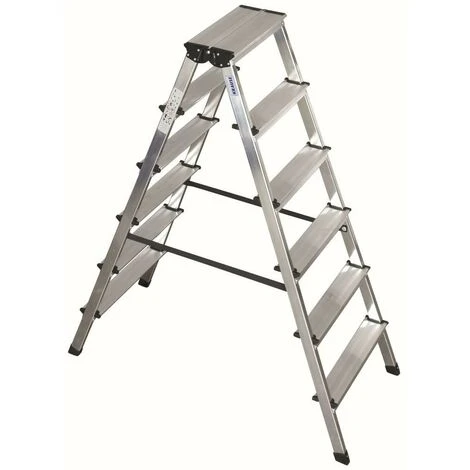 Die robuste und handhabbare Doppelaluminiumschabe kann auf beiden Seiten montiert werden und ist mit zwei Sicherheitsgurten und rutschfesten Sabotern ausgestattet. Der Scheitel kann platzaufgeklappt werden und kann daher in den geringsten Ecken platziert werden. Geh-/Halterverbindungen werden mehrfach vernietet und daher besonders stabil. Das Escabeau ist ideal für den universellen Einsatz in Handwerk.