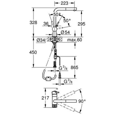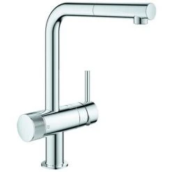 GROHE Blue Pure Minta Einhand-Spültischbatterie mit Filterfunktion Einlochmontage L-Auslauf herausziehbarer Mousseurauslauf separater Griff für gefiltertes Wasser Oberteil 1/2” GROHE StarLight Oberfläche GROHE SilkMove 46 mm Keramikkartusche schwenkba