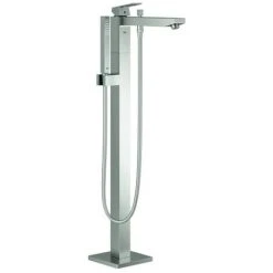 GROHE Eurocube Einhand-Wannenbatterie DN 15, Bodenmontage Fertigmontageset 45 984 ohne Rohbau-Set GROHE SilkMove 35 mm Keramikkartusche mit Temperaturbegrenzer GROHE StarLight Oberfläche automatische Umstellung: Wanne/Brause Auslauf mit Mousseur Handbrau