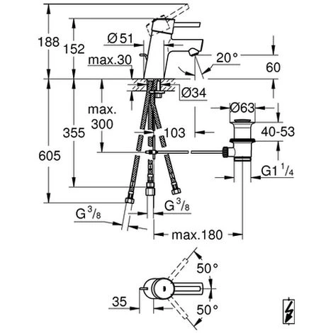 GROHE Concetto Einhand-Waschtischbatterie, DN 15 S-Size Einlochmontage GROHE SilkMove 35 mm Keramikkartusche variabel einstellbare Mengenbegrenzung GROHE StarLight Oberfläche GROHE QuickFix Schnellbefestigungssystem Auslauf mit Strahlregler Zugstangen-Ab