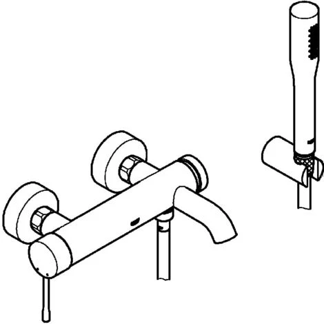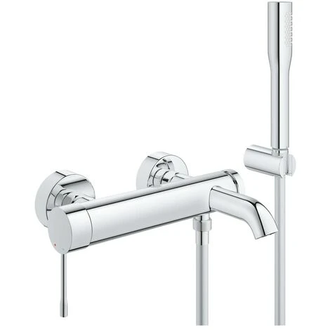 GROHE Essence Einhand-Wannenbatterie, DN 15 Wandmontage GROHE SilkMove 35 mm Keramikkartusche mit Temperaturbegrenzer GROHE StarLight Oberfläche automatische Umstellung: Wanne/Brause Auslauf mit Mousseur Brauseabgang unten 1/2” integrierter Rückflussverhinderer S-Anschlüsse Eigensicher gegen Rückfließen mit Brausegarnitur Euphoria Cosmopolitan Stick (27 367) Handbrausehalter Tempesta 100 C (27 594) Brauseschlauch Silverflex 1.500 mm (28 364) Professional Edition