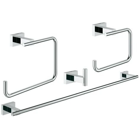 GROHE Essentials Cube Accessoires-Set – kubistische Perfektion für Ihr Konzept Erschaffen Sie in Ihrem Badezimmer einen eleganten, durchgängigen Look mit einem kompletten Set geradliniger Accessoires. Das GROHE Essentials Cube 4-in-1-Accessoires-Set enthält die wesentlichen Elemente, mit denen Sie einem eleganten, komfortablen Konzept den letzten Schliff geben. Mit Handtuchring, 600-mm-Handtuchhalter, Bademantelhaken und WC-Papierhalter. Dieses Set mit glänzender, langlebiger GROHE StarLight Chromoberfläche enthält alles, was Sie brauchen, um Ihr Badezimmer abzurunden. Alle zueinander passenden Elemente sind auf optische Harmonie und herausragende Funktionalität ausgelegt.Farbe: chrom glänzendMaterial: MetallBadetuchhalter: 55,8 cmbestehend aus: Bademantelhaken, WC-Papierhalter, Badetuchhalter und HandtuchringBefestigung: zum BohrenGROHE StarLight® Oberflächeverdeckte Befestigung