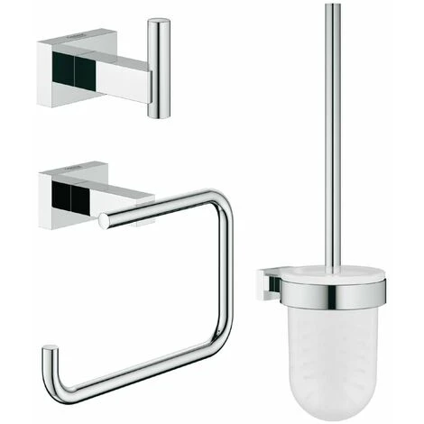 GROHE Essentials Cube Accessoires-Set – ideal für stilvolle WCs Ergänzen Sie Ihr Badezimmer oder Ihr WC mit dem kühlen, minimalistischen Stil eines Sets mit Accessoires im klaren Design. Das GROHE Essentials Cube 3-in-1-Accessoires-Set rundet ein elegantes, komfortables Badezimmer- oder WC-Konzept perfekt ab – Bademantelhaken, WC-Papierhalter und WC-Bürstengarnitur. Dieses Set mit glänzender, langlebiger GROHE StarLight Chromoberfläche enthält alles, was Sie brauchen, um Ihr Badezimmer abzurunden. Alle zueinander passenden Elemente sind auf optische Harmonie und herausragende Funktionalität ausgelegt.Farbe: chromMaterial: Glas/Metallbestehend aus: Bademantelhaken, WC-Papierhalter und WC-BürstengarniturBefestigung: zum BohrenGROHE StarLight® Oberflächeverdeckte Befestigung