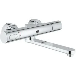 GROHE Eurosmart CE Infrarot-Elektronik Waschtisch-Wandarmatur mit Mischeinrichtung und Thermostat, DN 15 mit Infrarot-Sensor für bidirektionale Kommunikation 6 V Lithium-Batterie, Typ CR-P2 Batterielebensdauer ca. 7 Jahre (bei 150 Betätigungen pro Tag) Aktivierung per Hand, Deaktivierung bei Verlassen des des Erfassungsbereiches (Hand-Körper Erfassungsart) zwei zusätzliche Erfassungsarten einstellbar (Hand-Hand und Körper-Körper) GROHE StarLight Oberfläche GROHE CoolTouch Laminarstrahlregler 9 l/min Rückflussverhinderer, Schmutzfangsiebe GROHE SafeStop Sicherheitssperre bei 38 GradC schwenkbarer Gussauslauf 219 mm Ausladung 287 mm Schwenkbereichsbegrenzer 130 Grad, arretierbar mit verdeckten S-Anschlüssen Rosetten mit Wandabdichtung mehrstufige Batteriezustandsanzeige 7 voreingestellte Programme automatische Spülung, thermische Desinfektion, Reinigungsmodus zusätzliche Funktionen und Einstellungen mit Fernbedienung 36 407 CE-Zeichen Armaturengruppe I nach DIN 4109