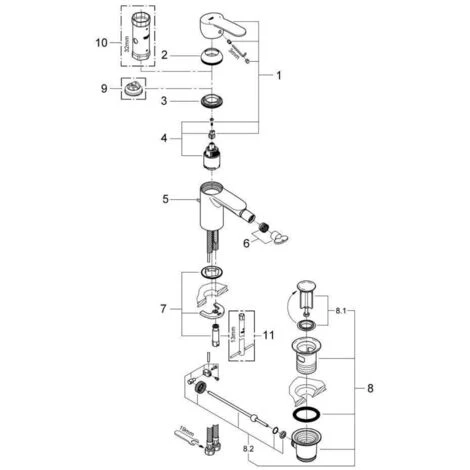 GROHE Eurostyle Cosmopolitan Einhand-Bidetbatterie, DN 15 Einlochmontage GROHE SilkMove 35 mm Keramikkartusche variabel einstellbare Mengenbegrenzung GROHE StarLight Oberfläche GROHE FastFixation Schnellbefestigungssystem Kugelgelenk-Mousseur Zugstangen-Ablaufgarnitur 1 1/4” flexible Anschlussschläuche