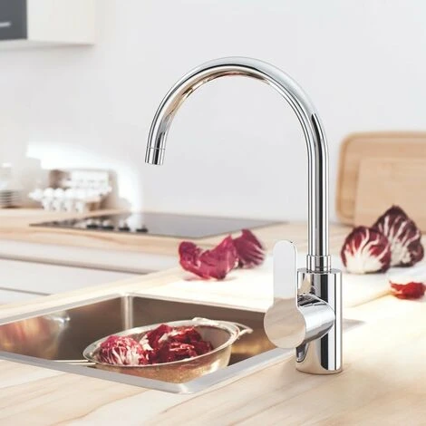 GROHE Eurostyle Cosmopolitan Einhand-Spültischbatterie, DN 15 hoher Auslauf Einlochmontage GROHE StarLight Oberfläche GROHE SilkMove 35 mm Keramikkartusche GROHE Zero getrennte innenliegende Wasserwege – kein Kontakt mit Blei oder Nickel innerhalb der Armatur Auslauf mit Mousseur variabel einstellbare Mengenbegrenzung schwenkbarer Rohrauslauf Schwenkbereich wählbar: 0 Grad / 150 Grad flexible Anschlussschläuche GROHE FastFixation Schnellbefestigungssystem