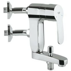 GROHE Eurostyle Cosmopolitan Vertica-Einhand-Wannenbatterie, DN 15 Wandmontage Bedienungshebel aus Metall GROHE SilkMove 46 mm Keramikkartusche GROHE StarLight Oberfläche variabel einstellbare Mengenbegrenzung automatische Umstellung feststellbar: Wanne/Brause arretierbarer Auslauf integrierter Rückflussverhinderer im Brauseabgang 1/2” Anschlusswinkel 45 Grad Wandrosetten aus Metall Sonderzubehör: Temperaturbegrenzer 46 375 Eigensicher gegen Rückfließen Armaturengruppe I nach DIN 4109