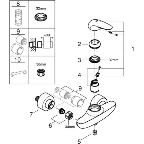 GROHE Eurostyle Einhand-Brausebatterie, DN 15 Wandmontage geschlossener Metall-Hebelgriff GROHE SilkMove 35 mm Keramikkartusche mit Temperaturbegrenzer GROHE StarLight Oberfläche variabel einstellbare Mengenbegrenzung Brauseabgang 1/2” mit integriertem Rückflussverhinderer verdeckte S-Anschlüsse Eigensicher gegen Rückfließen