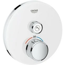 Das schicke, schlanke Grohtherm SmartControl Unterputz-Thermostat im wunderschönen Moon White ist nicht nur ästhetisch ansprechend, sondern bietet auch präzise Kontrolle. Dank der innovativen SmartControl Technologie lässt sich die Wassermenge durch Drücken und Drehen eines Knopfes regeln. Die integrierte Grohe TurboStat Technologie beugt unerwünschten Temperaturschwankungen vor. Dank der Grohe EasyLogic Kennzeichnungen und der Struktur der Knöpfe mit auswechselbaren Symbolen sind diese leicht und intuitiv zu bedienen. Die familienfreundliche Überbrückungstaste Grohe SafeStop ermöglicht es, eine maximale Temperatur von 38 °C einzustellen. So lassen sich Verbrennungen verhindern. Mit dem optionalen Grohe SafeStop Plus Temperaturbegrenzer lässt sich ein weiterer Höchstwert von 43 °C für zusätzliche Sicherheit ergänzen. Die wassersparende Grohe EcoJoy Technologie bietet die Möglichkeit, den Volumenstrom zu reduzieren ohne zu Beeinträchtigungen beim Duscherlebnis zu führen. Dank des Grohe QuickFix Systems ist die Montage schnell und direkt möglich. Das schlanke Profil erleichtert das Reinigen und die schicke und dabei langlebige Grohe StarLight Oberfläche strahlt noch nach Jahren makellos. Durch das schlanke, runde Design, das perfekt zur minimalistischen Optik passt, wird das Badezimmer-Design vollkommen.Bitte beachten Sie, dass dieser Thermostat zusammen mit der Grohe Rapido SmartBox (35600000) montiert werden muss.