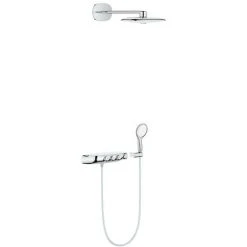 Sie sind auf der Suche nach einem Duschsystem, das Ihnen größtmöglichen Komfort in einzigartigem Design bietet? So soll Duschen sein: Die innovative SmartControl Technologie ermöglicht die separate und kombinierte Ansteuerung von Kopf- und Handbrause, die Auswahl unterschiedlicher Strahlbilder und die Regulierung der Wassermenge auf Knopfdruck. Sowohl Kopf- als auch Handbrause bieten zwei Strahlbilder. Die XXL-Kopfbrause mit dem stilvollen, weißen Brauseboden sorgt für ein einmaliges Duschgefühl und der Grohe TrioMassage Strahl entspannt und belebt Körper und Geist gleichermaßen – für ein ganz neues Duscherlebnis. Für kompromisslose Sicherheit verhindert die eingebaute Grohe TurboStat Technologie unerwünschte Temperaturschwankungen. Die Grohe SafeStop Taste schützt Ihre Haut vor Verbrühungen und dank Grohe CoolTouch wird auch das Thermostat niemals zu heiß. Die wassersparende Grohe EcoJoy Funktion trägt zum Umweltschutz bei. Dieses in einem organischen Design gehaltene System bietet auch eine Vielzahl weiterer Komfortfunktionen. Grohe Rainshower SmartControl – modernste Technologie made in Germany.Beachten Sie, dass dieses Duschsystem zusammen mit dem Grohe Rainshower 360 Rohbauset (26264001) und dem Grohtherm SmartControl Unterputzkörper (26449000) montiert werden muss.* Für die Kopfbrause kann bei der Installation Grohe Rain O2 oder PureRain als zweites Strahlbild eingestellt werden (werkseitig eingestellt: Grohe PureRain).