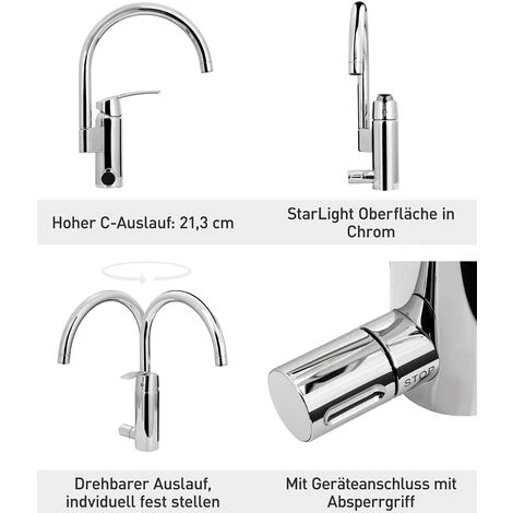 ✅ EINHEBELMISCHER: • Für Spüle • Schwenkbarer Auslauf • Keramikkartusche • Geschlossener Hebel • Geräteanschluss • Absperrventil • StarLight Oberfläche • Trinkwassersicherheit • 33,8 x 18,2 cm (H x T) • Chrom