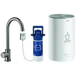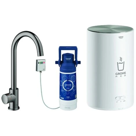 GROHE Red Mono Standventil und Boiler Größe M GROHE Red Mono Standventil, Einlochmontage C-Auslauf GROHE ChildLock Drucktasten für kochendes Wasser TÜV zertifizierte elektronische Sicherung gegen versehentliches Aktivieren GROHE StarLight Oberfläche